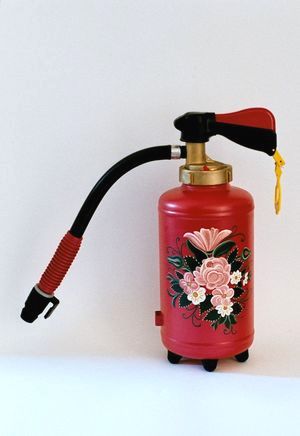 Neugestaltete Bauernmalerei auf einem Feuerlöscher |