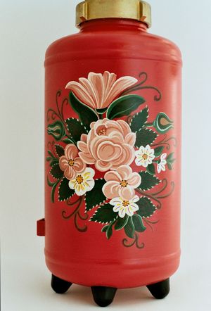 Der Feuerlöscher wurde angeschliffen und farbig neu grundiert. Die Bauernmalerei wurde in Kaseintechnik ausgeführt und zum Schluss mit einem Klarlack überzogen. |