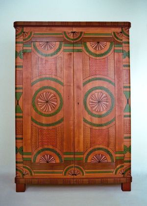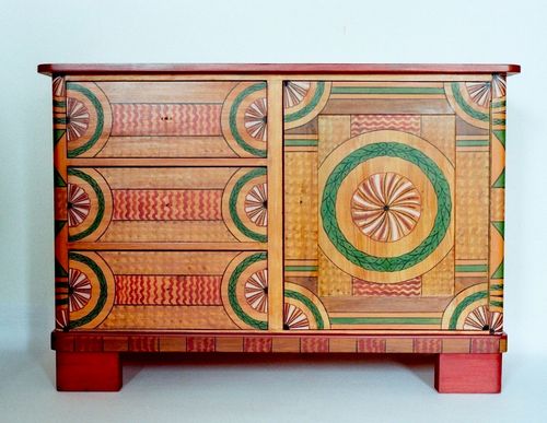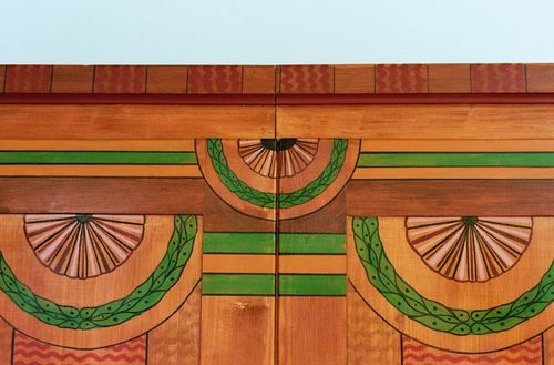 Ihr Aufbau zeigt die Freude an geometrischen Formen, welche der Möbelmaler hier virtuos eingesetzt hat |