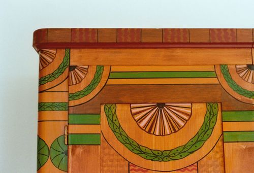 Die stilisierten Lorbeerkränze sowie die angedeuteten Blüten unterscheiden sich deutlich von den sonst üblichen Motiven der Möbelmalerei. |