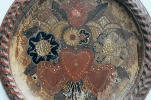 Der Hochzeitsteller wurde über Jahre hin ohne Schutz auf dem Dachboden aufbewahrt. Temperaturschwankungen und mehrere unsachgemäße Reinigungen zogen die Bemalung stark in Mitleidenschaft.