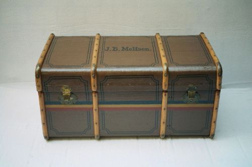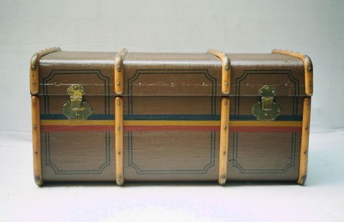 Der Koffer war altersbedingt in einem schlechten Zustand. Die farbliche Fassung war auf sämtlichen Flächen nicht bzw. nur noch bruchstückhaft vorhanden. Das Trägermaterial, ein Leinenstoff, hatte sich vom Untergrund getrennt.