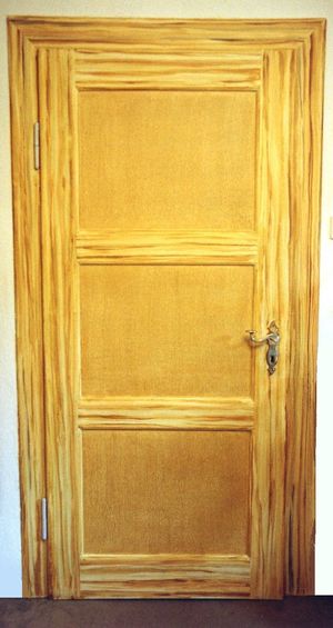 Die maserierte Tür: Die Türfüllungen wurden sehr ruhig gehalten, um die später noch aufgebrachten Ornamente besser zur Geltung zu bringen. |