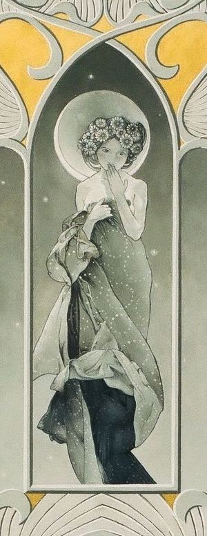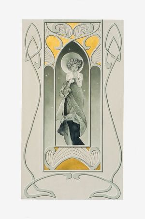 Aufgabenstellung: Für die Türfüllungen wünschte sich der Auftraggeber eine Interpretation des Jugendstilgemäldes "Der Mond" von Alfons Mucha mit stilgerechter Rahmung und einfassender Ornamentik.